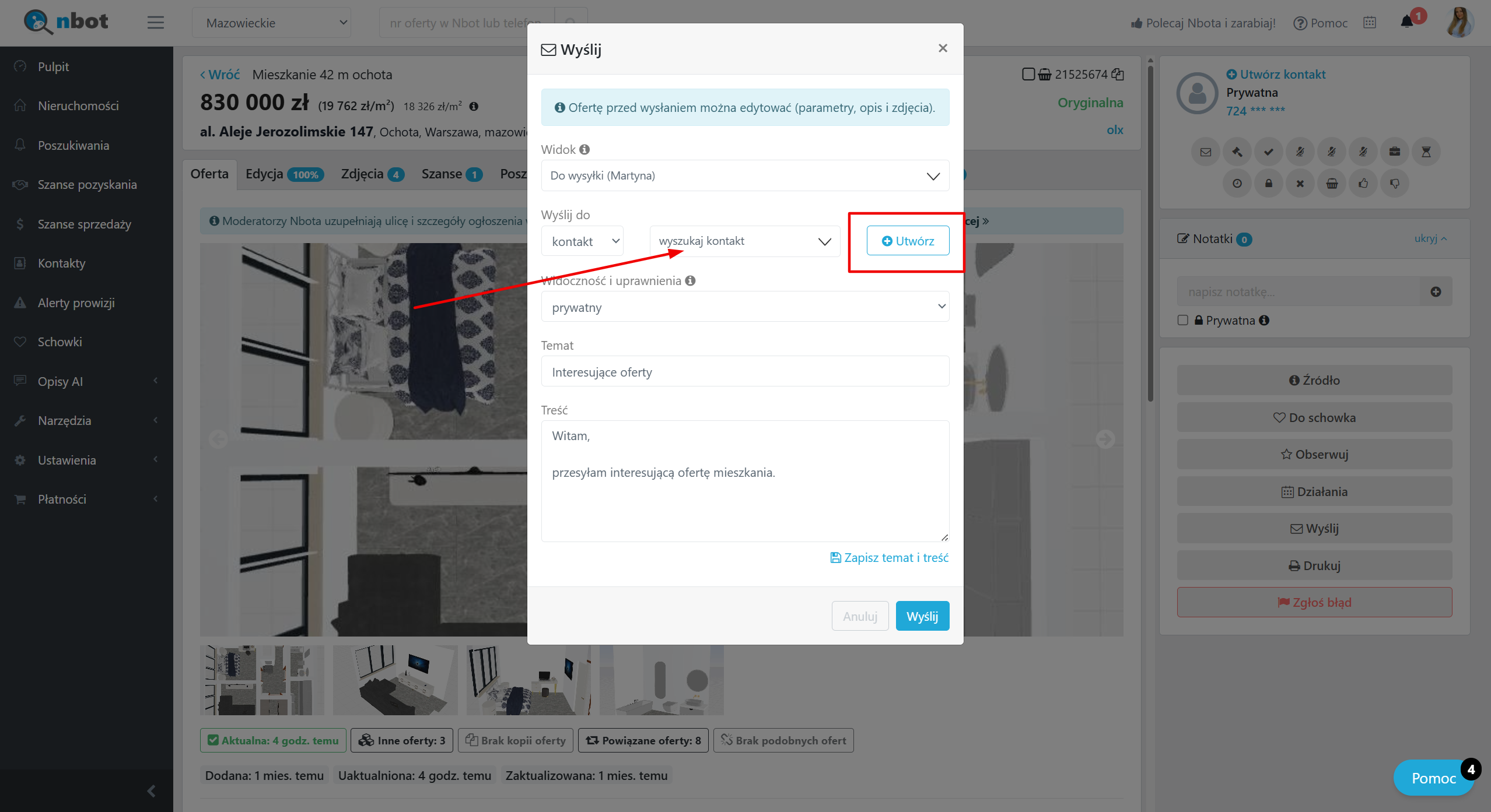 ✅ Jeśli chcesz wysłać ofertę do kilku nowych kontaktów, których jeszcze nie masz w bazie, kliknij Utwórz, aby dodać nowego klienta. Po zapisaniu, nowo utworzony kontakt automatycznie pojawi się jako pierwszy na liście po kliknięciu „wyszukaj kontakt” i będzie od razu dostępny do zaznaczenia przy wysyłce.